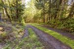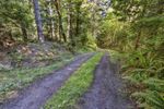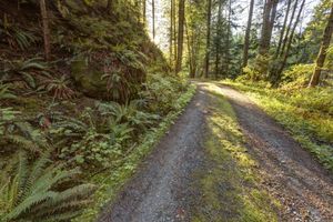 A scenic path winds through a temperate broadleaf and mixed forest in Bellingham, Washington. The vibrant autumn colors of the leaves create a picturesque landscape. Sunlight filters through the trees, illuminating the path.
