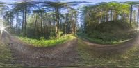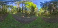the view from a fish eye lens of a path through woods and grass, with trees in the background
