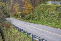 A picturesque view of a high road surrounded by lush vegetation and trees in the countryside. The asphalt road is lined with trees and hillsides, creating a scenic route. This image showcases the beauty of nature and the peacefulness of the rural surroundings. The road surface is well-maintained, with a guard rail and an Armco barrier ensuring safety for drivers. The autumn leaves add a touch of color to the scene. Taken during the day, this picture is perfect for illustrating concepts like rural infrastructure, paths, and elevated roads.