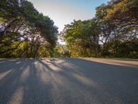the shadow of trees cast across a paved road in the middle of the woods, casting long shadows