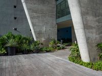 a concrete and wood walkway that has plants growing on it in pots on both sides of a building