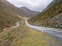 This stunning photo captures a winding country road in Austria, surrounded by breathtaking mountain scenery. The road stretches through lush valleys and is nestled beneath snow-capped peaks, creating a picturesque landscape. A single passenger car can be seen on the opposite side of the road, adding a sense of scale to the vastness of the surroundings. To the right of the road, a lone figure stands, emphasizing the peacefulness of the area. The day is cloudy and gloomy, with a grey sky overhead, which adds a touch of dramatic atmosphere to the scene. Despite the rain and wet conditions, the natural beauty of the location shines through.