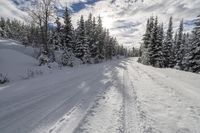 A picturesque winter landscape in the Okanagan Valley, British Columbia. Sunlight filters through the snowy evergreen forest as the road stretches into the wilderness. The clear sky illuminates the straight path ahead.
