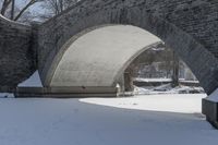 A picturesque landscape in Canada during winter. The clear sky contrasts with the frozen lake. A concrete arch bridge spans over the snow-covered road, surrounded by trees and nature. Autumn colors create a beautiful backdrop for Toronto's rural area.