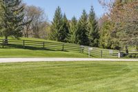 a wooden fence in a green field of grass near trees and flowers on the side of the road