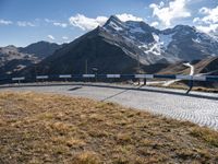 A picturesque road in Austria winding through breathtaking mountain landscapes. Clear skies overhead accentuate the beauty of the surrounding nature. Cobblestone path lined with Armco barriers and guard rails ensures a safe journey.