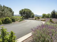 Picturesque Rural Road in California: Lush Vegetation and Colorful Flowers