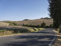 A scenic view of a rural road winding through the picturesque landscape of Tuscany, Italy. Lush green grass surfaces, rolling highlands, and rugged hills create a beautiful natural setting. Clear skies and cypress trees add to the charm of this European wilderness.