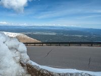 A snowy road in Colorado leading towards Pikes Peak. Elevated viewpoint offers an expansive overview of the landscape. Clouds hover above the high summit. A top-down aerial view capturing the beauty of the USA.