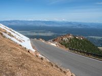a man is riding his bike down a mountain road with snow and rocks in the background