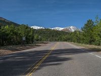 an empty road with lots of trees in the background in the wild region of colorado