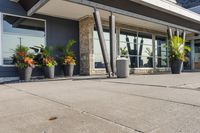 This stock photo shows planters lining the sidewalk in front of a business building in Toronto, Ontario, Canada. The building houses an entertainment center and is located in a bustling residential area. The architecture of the building features a concrete facade with leafy trees providing shade. The walkway is made of asphalt with tile flooring. The clear sky overhead adds to the overall pleasantness of the public space. Passersby can also find various shops and storefronts along the road. This image captures the essence of urban life in Toronto while highlighting the importance of greenery and real estate in the cityscape.