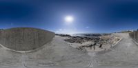 a view from a large fish eye lens of a person skateboarding along a stone pathway