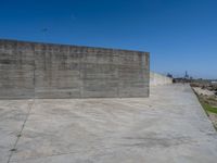 Concrete wall in Porto, Europe, overlooking the open space of a coastal beach. Clouds dot the clear day sky above the ocean. The wall stands resilient against the coastal surface, defining Porto's waterfront.
