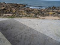 Aerial view of Porto, Portugal's coastal concrete surface. Clear sky with high position casting hard shadows. Grey sky adds a touch of gloom over the open space. Shadows create a contrast against the ocean, portraying a gloomy yet captivating scene.