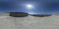 a skateboarder grinding a ramp next to the ocean on the beach and the moon