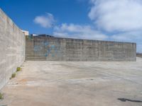 A concrete wall in Porto, Portugal, overlooking the European coastline and ocean. The open space beach under a cloudy sky provides a serene coastal view. Water surface glistens on a sunny day.