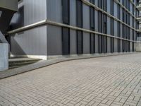 the empty brick walkway in front of a modern building with tall windows, on an otherwise busy day