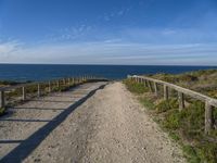 This image captures a coastal landscape in Portugal, Europe. The straight road stretches through the scene, with azure waters of the ocean on one side and sandy dunes on the other. The road surface is made of asphalt and lined with a guard rail and fence. The clear sky with fluffy clouds meets the horizon in the distance. Vegetation and wood add natural elements to the scenery. An Armco barrier creates a safety barrier along the road. This photo showcases the beauty of Portugal's coastline and the peacefulness of the landscape.