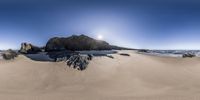 a sandy beach with rocks and water with blue skies in the background and sun streaming through