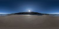an island sits on the sand at the bottom of a beach as a sunny and clear blue sky hangs above it