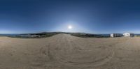 360 - angle view of a dirt road near a beach with a building and water in the background