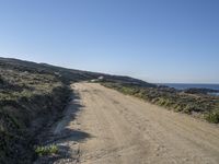 A picturesque coastal landscape in Portugal. The sandy beach stretches towards the clear sky, with lush vegetation along the shore. The asphalt road cuts through the grassy terrain, offering a scenic drive with mountain landforms in the horizon.