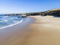 Aerial view of a sandy beach in Portugal, with waves gently washing onto the shore. The clear sky and coastal landscape create a serene and picturesque scene. The steep hill in the distance adds to the natural beauty of the open space.