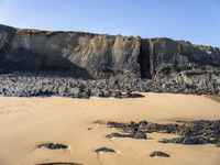 A beautiful coastal landscape in Portugal with a clear blue sky and the deep blue ocean water. The sandy beach stretches along the shore, with rocks scattered on the surface. The open space and serene nature make it a perfect place for a relaxing day by the shore.
