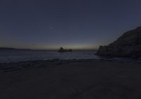 a long exposure photo of rocks along the ocean on a clear night time with the sun rising