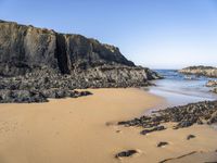 A person is carrying an umbrella along the beach near the water and rocky cliff formations in Portugal. The beautiful coastal landscape features a clear sky and pristine sandy shore. This idyllic scene captures the natural beauty of Europe's coastline and the calming sound of waves crashing onto the shore. Perfect for illustrating the concept of open space, nature, and the feeling of serenity near the ocean.