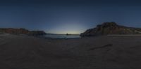 A panoramic view taken at sunset on a beach in Portugal. Rocky formations create a beautiful coastal landscape. The clear sky is filled with shades of orange and pink. A serene and calming scene.