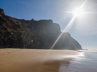 Sunny day on Portugal's coast with sand, ocean, and clear sky. The sun is visible, enhancing the open space of the beach landscape. A quintessential European coastal scene.