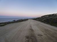 a dirt road near a body of water and hills at sunset with a lighthouse in the background