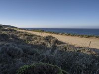 a man riding a motorcycle down the side of a dirt road next to an ocean