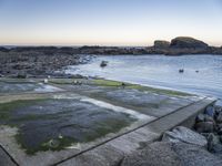 This is an image of a fire hydrant next to the ocean with rocks and water surrounding it. The boats on the water indicate that this photo was taken near a coastal area. The clear sky and the horizon create a beautiful landscape, with the water reflecting the colors of the dawn. This picture was captured in Portugal, a country known for its stunning coastal views. The concrete surface of the boat ramp provides an entry and exit point for boats. This image represents the connection between human infrastructure and the natural beauty of the ocean.