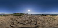 a panoramic photo of a dirt path leading to the beach under a blue sky with a sun behind it