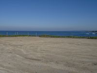 an open field with some very empty beaches and a blue water in the background on a clear day