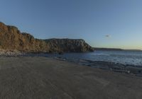 This image captures the beauty of the European coastline in Portugal during the dawn. The landscape features mountains, open spaces, and the vast ocean. The rocky bedrock terrain adds texture to the picture, while the clear sky and horizon provide a tranquil backdrop. The grey concrete surface near the beachbank contrasts with the natural elements, creating a visually stunning scene. This photo perfectly encapsulates the break of day in Portugal's coastal region.