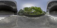 a fish eye view of some concrete buildings and trees on the other side of a road