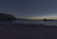 A dark night sky over the coastal terrain of Portugal. Waves crash onto the beach, creating a mesmerizing atmosphere. The horizon gleams with the first light of dawn, illuminating the clear sky and open space.