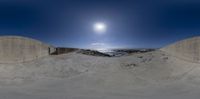 this photo features a wide angle lens of the sky showing a sunny day and some blue skies above a sandy beach