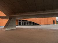 Modern architecture in Porto, Portugal. A concert hall with unique design elements casting shadows on the asphalt surface. Clouds drift over the urban landscape, blending with the brick wall backdrop.