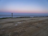 a sandy road on the beach near the ocean at sunset or dawn with a clock post and water puddles
