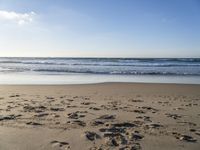 footprints on the beach with waves rolling in in the distance and sun shining down onto the ocean