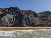 A breathtaking aerial view of Portugal's coastline under a clear sky. Sandy beaches, mountains, and ocean form a stunning landscape. Elevated perspective captures Europe's coastal beauty at its finest.