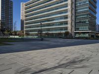 A modern office building in the business district of Lisbon, Portugal. Surrounded by skyscrapers and urban design. Clear sky and hard shadows create a striking urban landscape.