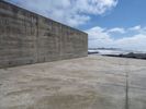 A concrete wall in Porto, Portugal, overlooking the coastal open space. The beach meets the ocean under a cloudy sky. The surface leads straight down the road to the water, defining Porto's distinctive coastal profile.