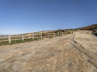 This image showcases a dirt road with a fence surrounding it, leading towards the ocean. In the distance, majestic mountains create a stunning backdrop. The clear sky and open space create a sense of serenity and freedom. The landscape features lush vegetation, including trees and grass. The road surface is composed of dirt and gravel. The presence of guard rails and an Armco barrier ensure safety along the coastal area. This picturesque scene is captured in Europe, specifically in Portugal. It is a perfect representation of a peaceful day in a coastal setting.