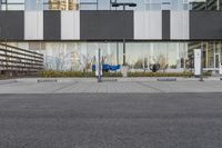 This image captures a view of a street in Toronto, Canada during dawn. The modern architecture of the buildings in the business district stands out against the clear sky. The street is lined with parking meters and electric car charging spaces, reflecting the city's commitment to sustainability. The low-rise residential area in the background contrasts with the urban design of the city. In the foreground, the road surface and flooring lead to the loading dock of a warehouse. This photo showcases the mix of urban and suburban elements in Toronto's metropolitan area.